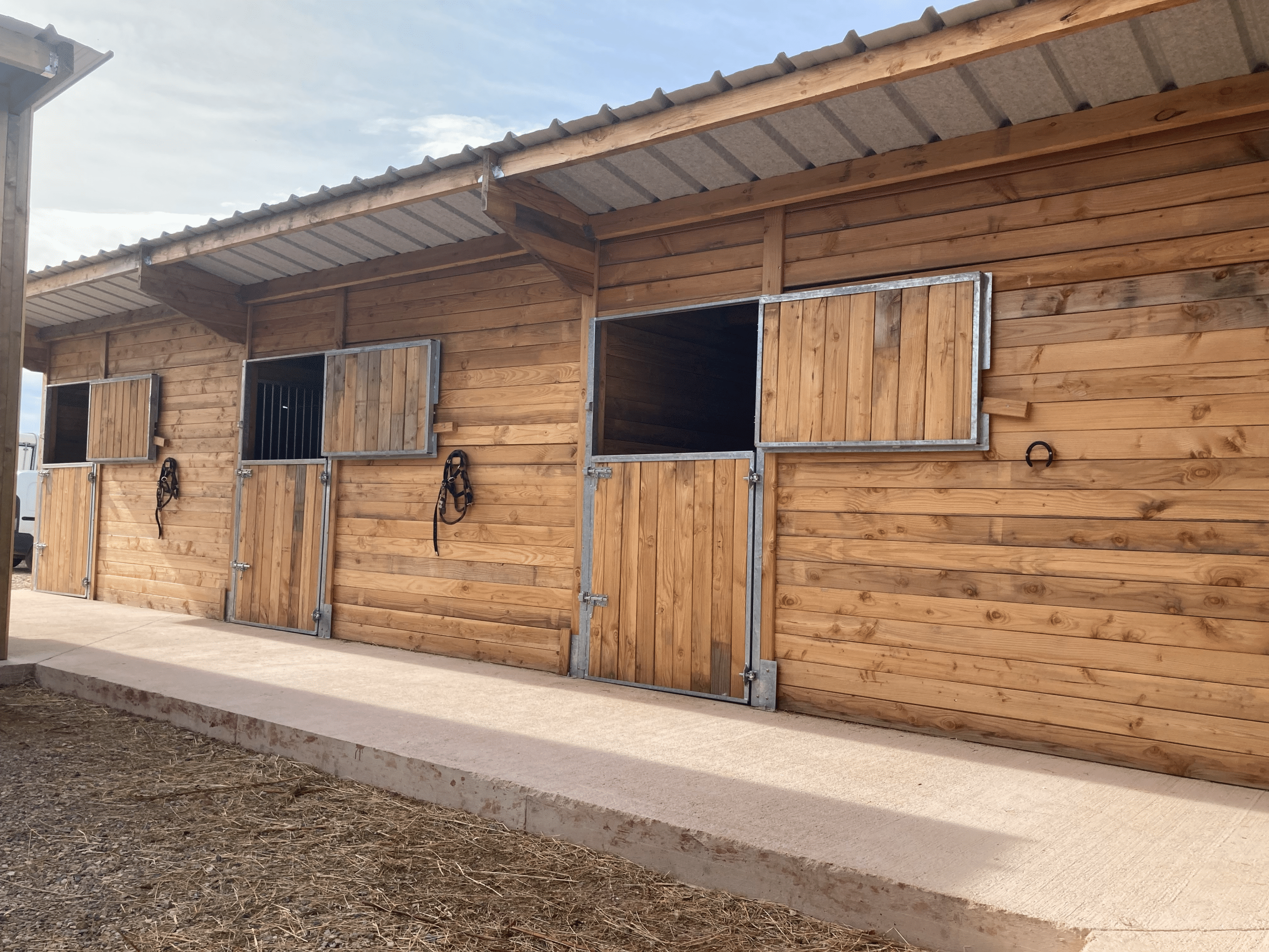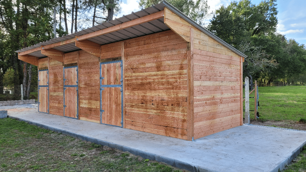 Le module 3 boxes en ligne de LCI Location est une solution modulable pour aménager une écurie fonctionnelle et confortable pour vos chevaux. Fabriqué en bois Douglas français 100 %, avec des parois de 48 mm d’épaisseur, il offre une excellente résistance aux intempéries et une bonne isolation thermique, garantissant le confort des animaux.