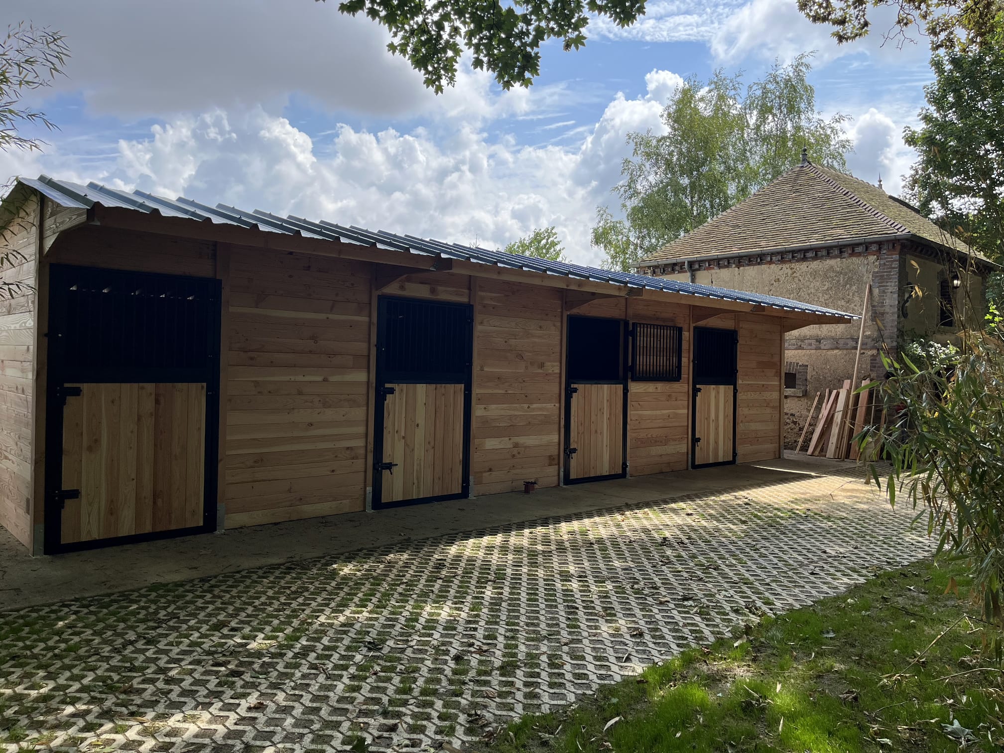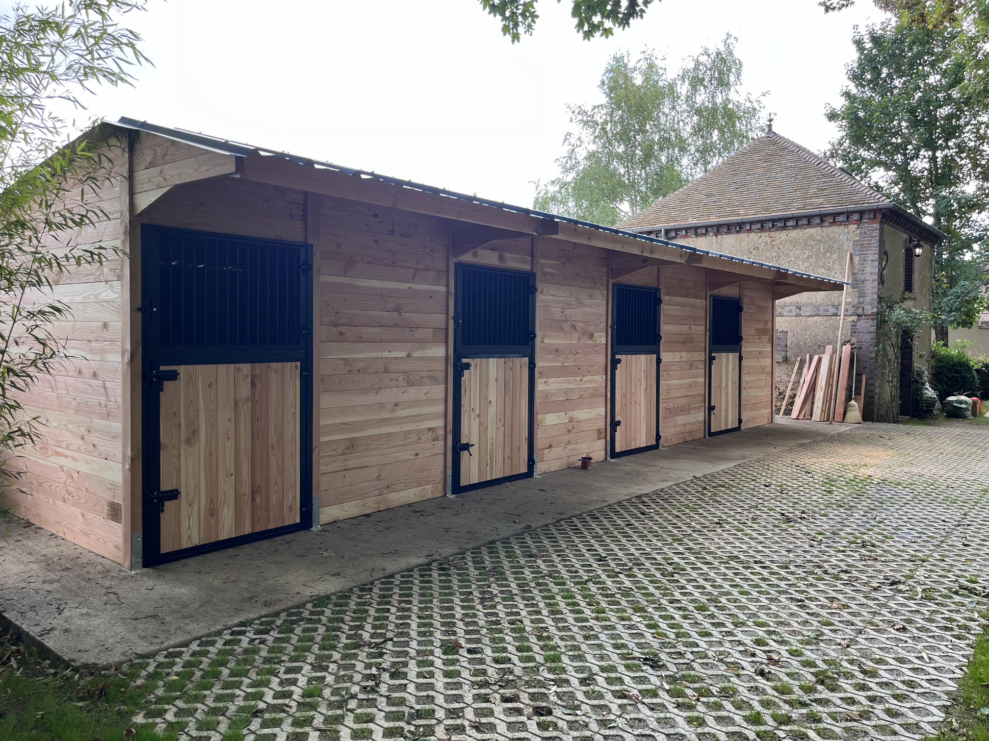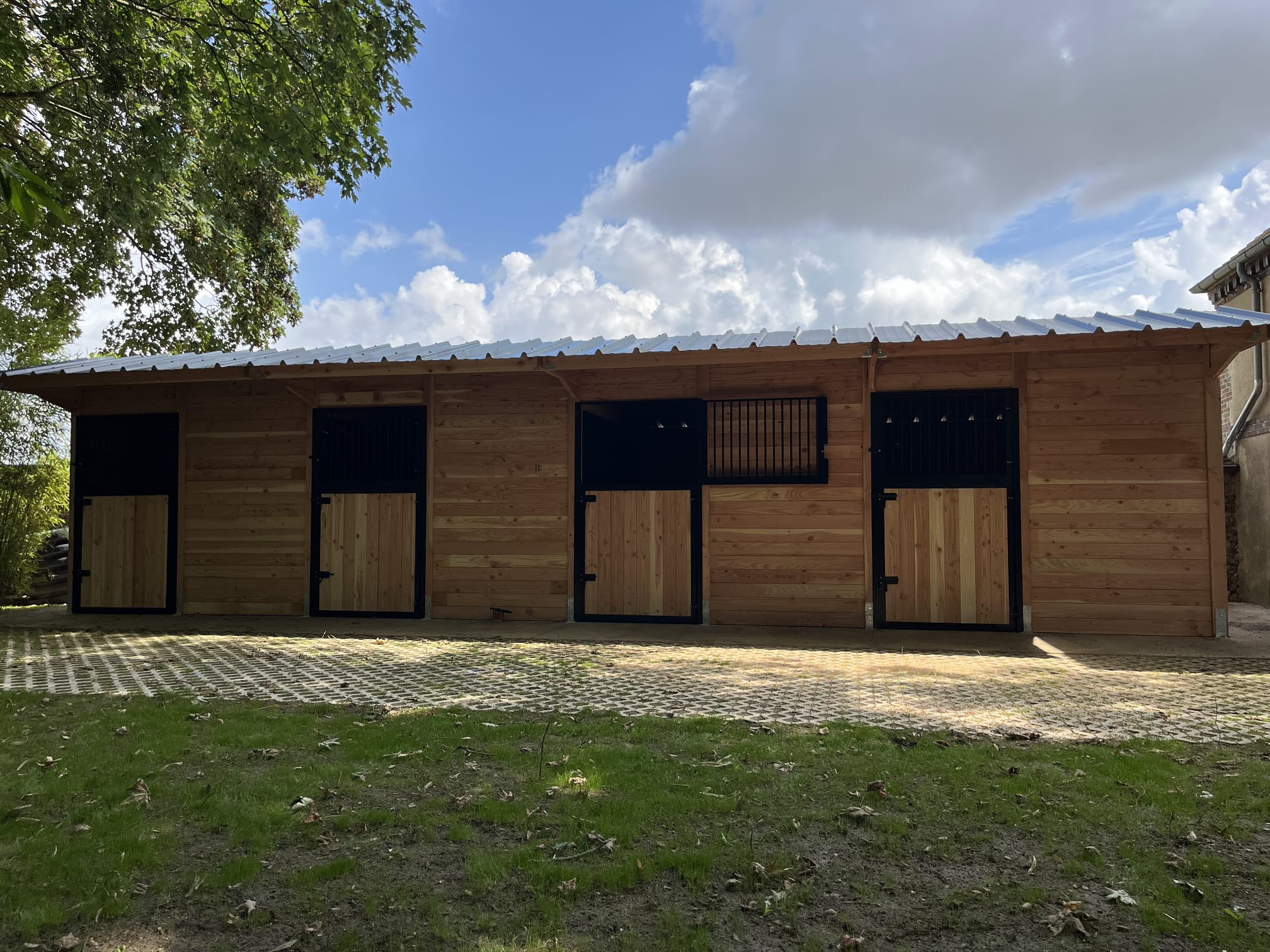 Le module 4 boxes en ligne de LCI Location est une solution modulable pensée pour aménager une écurie fonctionnelle et confortable. Fabriqué en bois Douglas français 100 %, avec des parois de 48 mm d’épaisseur, il offre une excellente résistance aux intempéries, une bonne isolation thermique et une durabilité adaptée à un usage intensif.