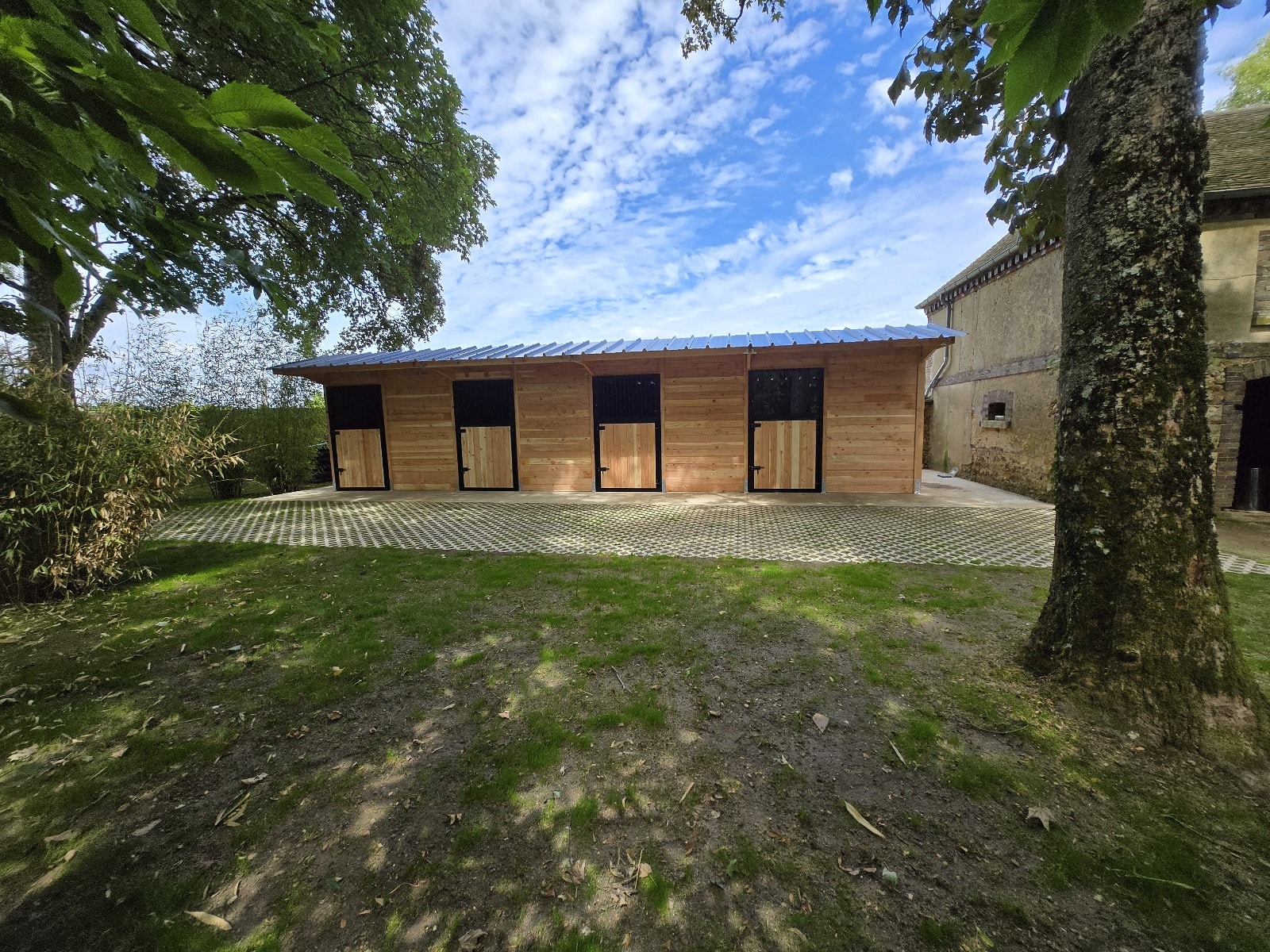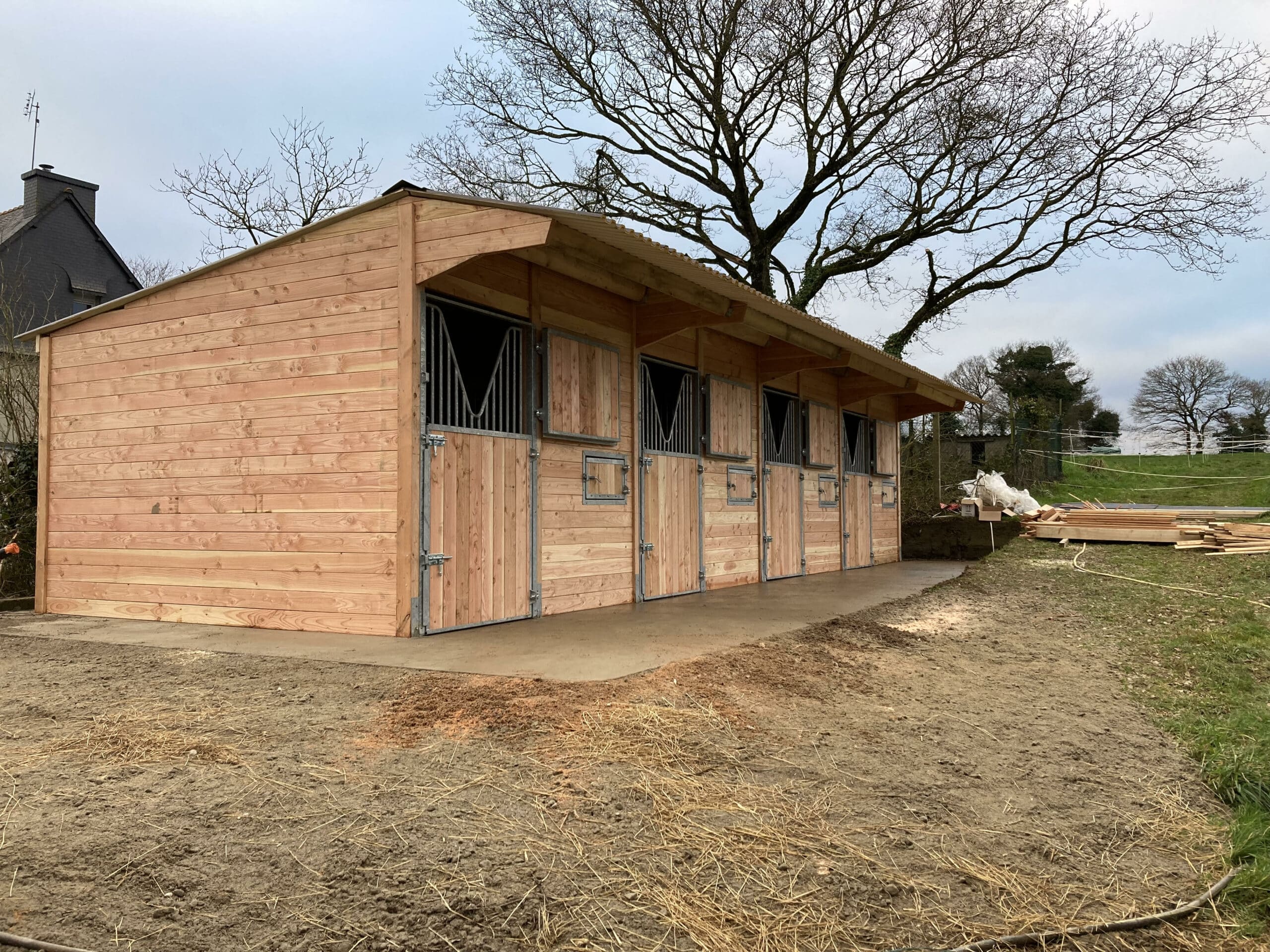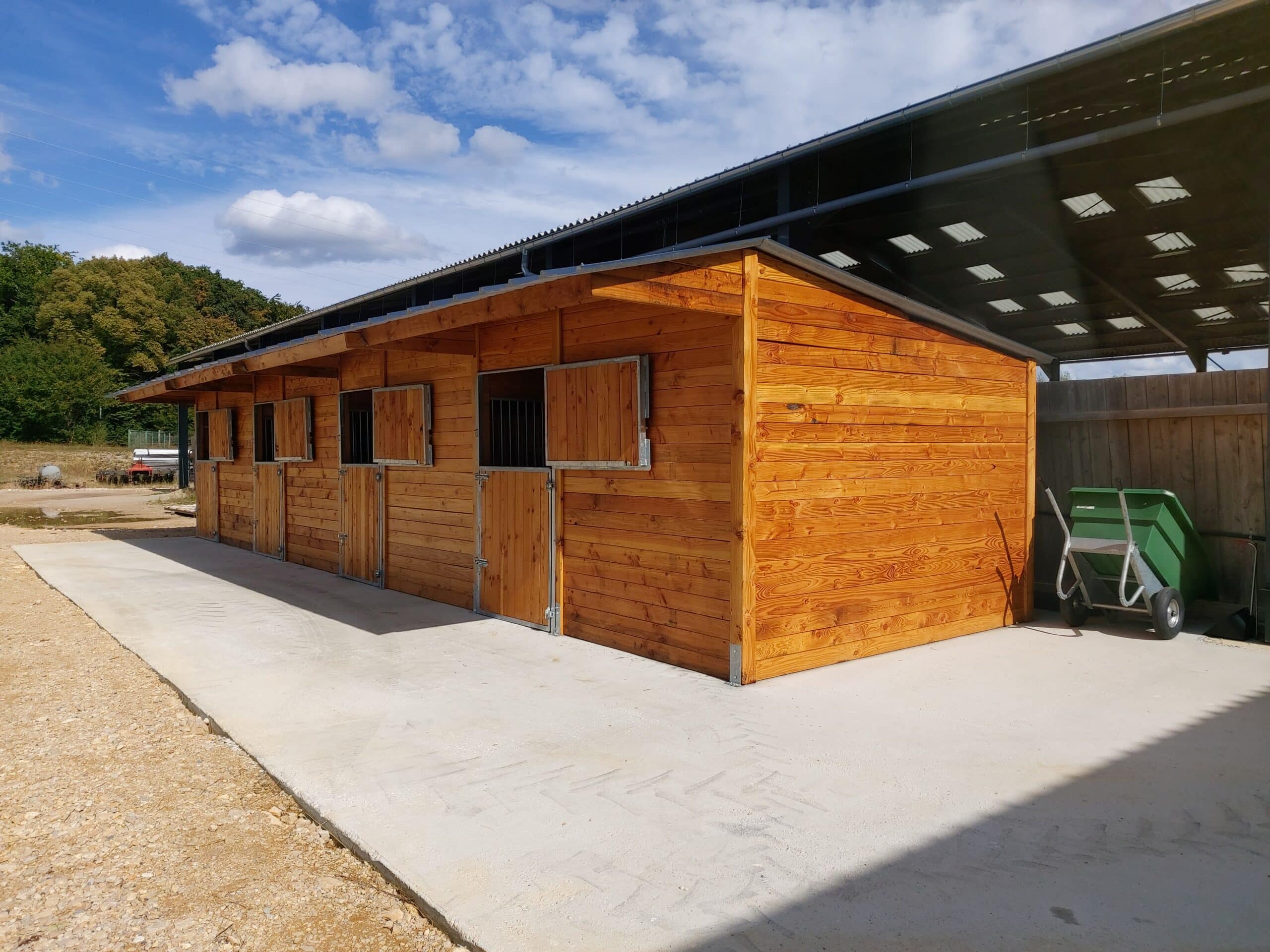 Le module 4 boxes en ligne de LCI Location est une solution modulable pensée pour aménager une écurie fonctionnelle et confortable. Fabriqué en bois Douglas français 100 %, avec des parois de 48 mm d’épaisseur, il offre une excellente résistance aux intempéries, une bonne isolation thermique et une durabilité adaptée à un usage intensif.